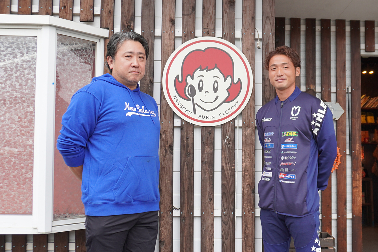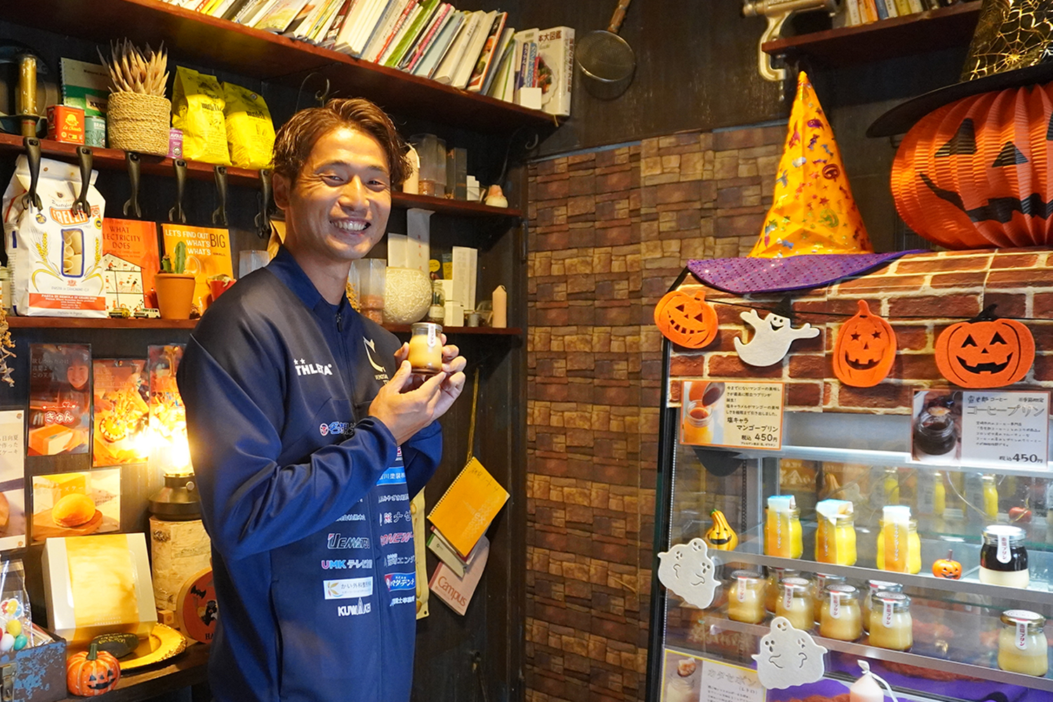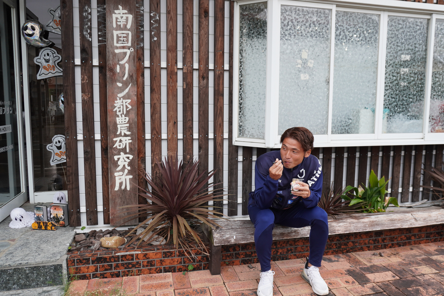 店舗前で山田雄太選手がプリンを楽しむひとコマ。