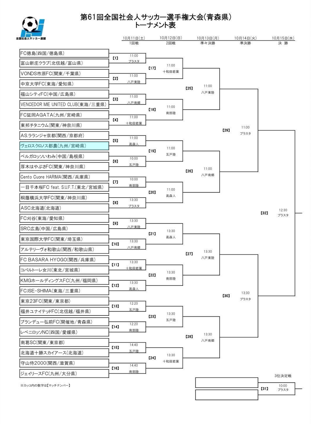 10月11日(土)から10月15日(水)に青森県で開催する第61回全国社会人サッカー選手権大会の組み合わせが決定しました。 ヴェロスロノス都農は、1回戦 AS.Laranja Kyoto(関西/京都府)と十和田市高森山人工芝多目的グラウンドにて対戦します。 大会概要 名称 第61回全国社会人サッカー選手権大会 開催期間 2024年10月11日(土)~10月15日(水) 会場 八戸市 プライフーズスタジアム(多賀多目的運動場) 八戸市東運動公園陸上競技場 八戸市南郷陸上競技場 十和田市 十和田市高森山球技場 十和田市高森山人工芝多目的グラウンド 五戸町 ひばり野公園陸上競技場 南部町 ふるさと運動公園陸上競技場 競技形式 32チームによるノックアウト方式にて優勝以下第4位までを決定する。(準決勝敗者同士による3位決定戦を行う) 競技会規定 試合時間 80分(前・後半40分) 試合時間内で勝敗が決定しない場合は、PK方式により勝者を決定する。 その他 本大会の成績で優勝から第4位までのチームで、全国地域サッカーチャンピオンズリース2025の出場権を得ていない場合は、最大で成績上位3チームに全国地域サッカーチャンピオンズリーグ2025への出場権を与えるものとする。 ただし、上記の成績で全国地域サッカーチャンピオンズリース出場権を得ることのできるチームは、9地域サッカー最上位リーグのチームで、かつ翌年度にJFLへ入会意思の確認ができたチームに限るものとする。 参加チーム数とその数 (1) 本大会は、下記により選出された32チームにより行う。 ① 9地域社会人サッカー連盟から各1チーム ② 前年度(2024年度)各地域の全社連登録数の比率で22チームを配分。 ③ 開催都道府県を代表する1チーム (2) 2025年度参加枠(32チーム) ① 北海道 社会人サッカー連盟 2チーム ② 東 北 社会人サッカー連盟 2チーム ③ 関 東 社会人サッカー連盟 7チーム ④ 北信越 社会人サッカー連盟 2チーム ⑤ 東 海 社会人サッカー連盟 4チーム ⑥ 関 西 社会人サッカー連盟 5チーム ⑦ 中 国 社会人サッカー連盟 3チーム ⑧ 四 国 社会人サッカー連盟 2チーム ⑨ 九 州 社会人サッカー連盟 4チーム ⑩ 開催県社会人サッカー連盟(青森県)1チーム 全国社会人サッカー連盟ホームページ https://www.jffms.jp/tournament/mos2024/terms 全国地域サッカーチャンピオンズリーグ出場の切符獲得を目指し、チーム一丸となって戦います!