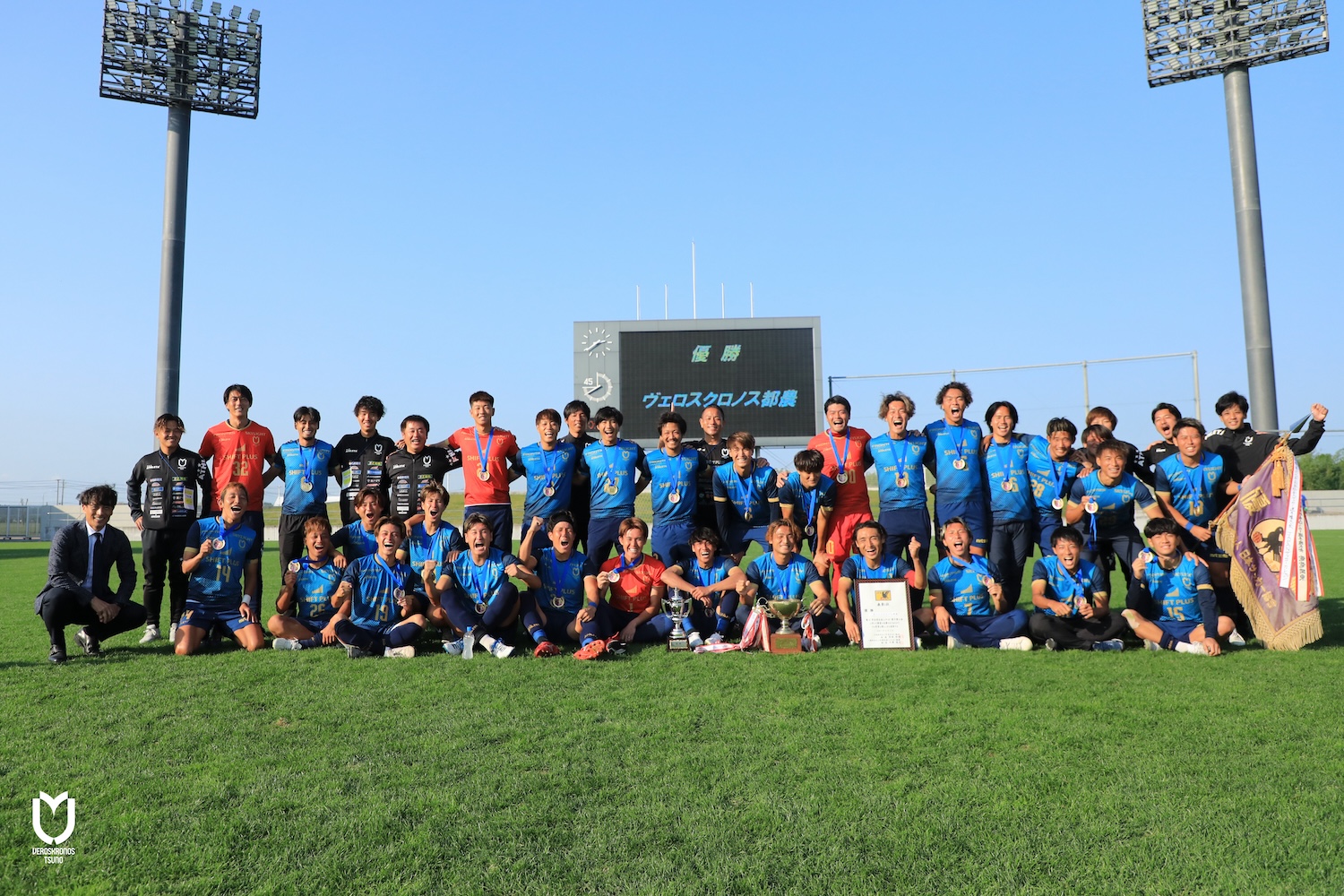 「ヴェロスクロノス都農」が、第61回全日本社会人サッカー選手権大会(以下「全社」)にて優勝。宮崎県勢初の日本一となりました。 今大会は、日本フットボールリーグ(以下「JFL」)昇格を懸けた全国地域サッカーチャンピオンズリーグ(以下「地域CL」)の代表権争いも兼ねており、地域CL出場権も4年連続で獲得しました。 2025年10月11日(土)から15日(水)の5日間行われた全社は、青森県八戸市を主会場として全国9地域の予選を勝ち抜いた32チームが参加。 負ければそこで終了となるトーナメント戦を、最大5日間連続で5連戦戦い抜く過酷な日程となります。 大会の上位3チームには地域CL出場権が与えられるため、九州リーグでの優勝を逃し出場権を得ていないヴェロスクロノス都農は、この大会で出場権を獲得することを今大会の第一目標として臨みました。 試合は40分ハーフで実施され、80分で決着がつかない際はPK戦で勝者を決します。 1回戦はAS.ラランジャ京都(関西)と対戦し2-0で退け、2回戦はベルガロッソいわみ(中国)に2-1の逆転勝ち。 3回線のCento Cuore HARIMA(関西)とは0-0からのPK戦を4-3で制して準決勝に進出しました。 準決勝はVONDS市原FC(関東)に2-0で快勝し、地域CLの出場権を獲得。 5日目の決勝はFC BASARA HYOGO(関西)に2-1で競り勝ち、宮崎県勢初の社会人サッカー日本一を成し遂げました。 試合情報はコチラから https://veroskronos.com/topics/detail/2025091206